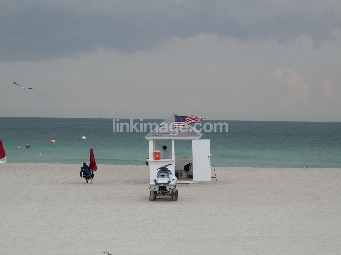 shore, sand, flag, lifeguard, shed, house, quad bike, look out, horizon, season, off-season, alone, buoy, seagull, cloud, overcast