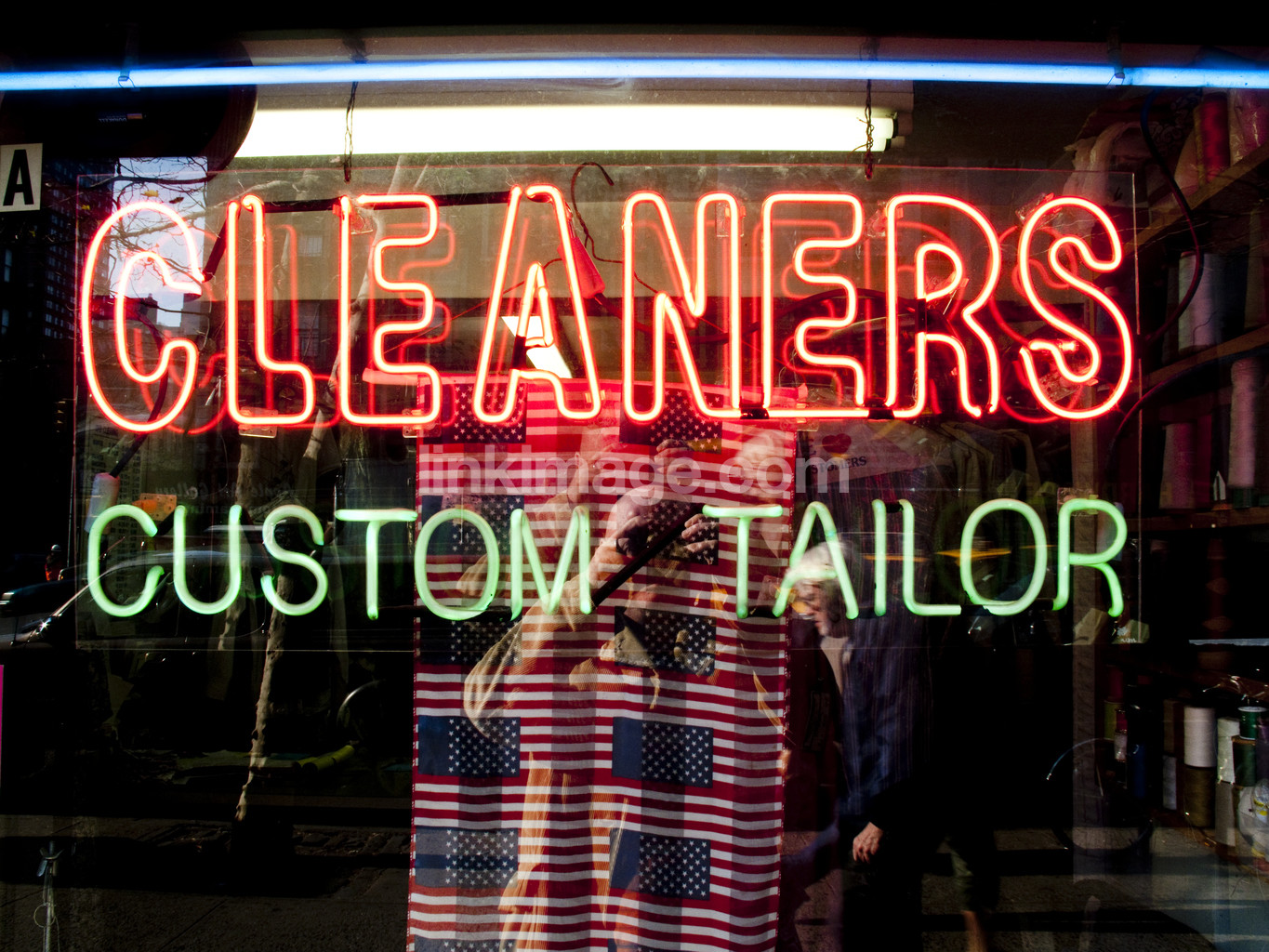 - dry cleaning, wash, laundry, tailor, seamstress, neon sign, storefront, reflection, photographer, american, flag