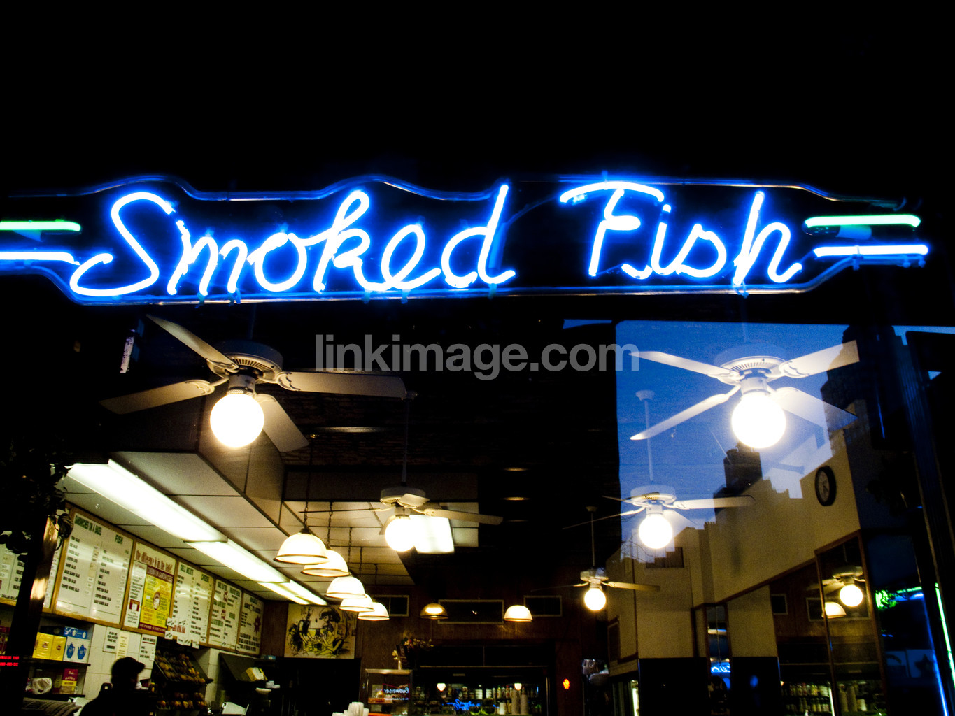 - restaurant, tavern, pub, fish, smoked, fan, lights, neon sign, storefront, window