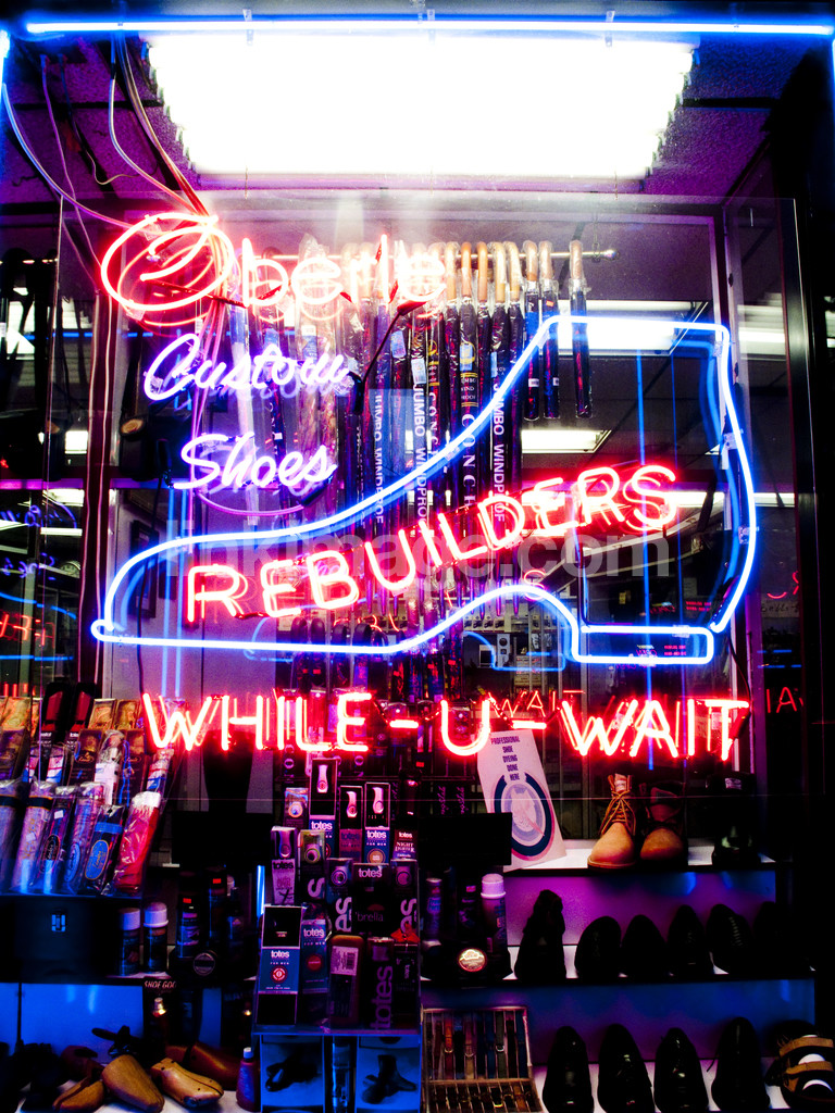 - shoemaker, neon sign, shoe, storefront, decorating, fluorescent, red, purple, blue