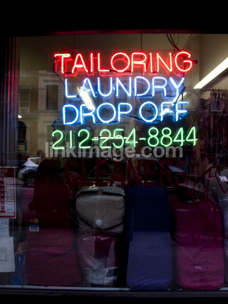 - tailor, seamstress, sewing, cook, wash, dry cleaning, drop-off, phone, number, neon sign, storefront, bags