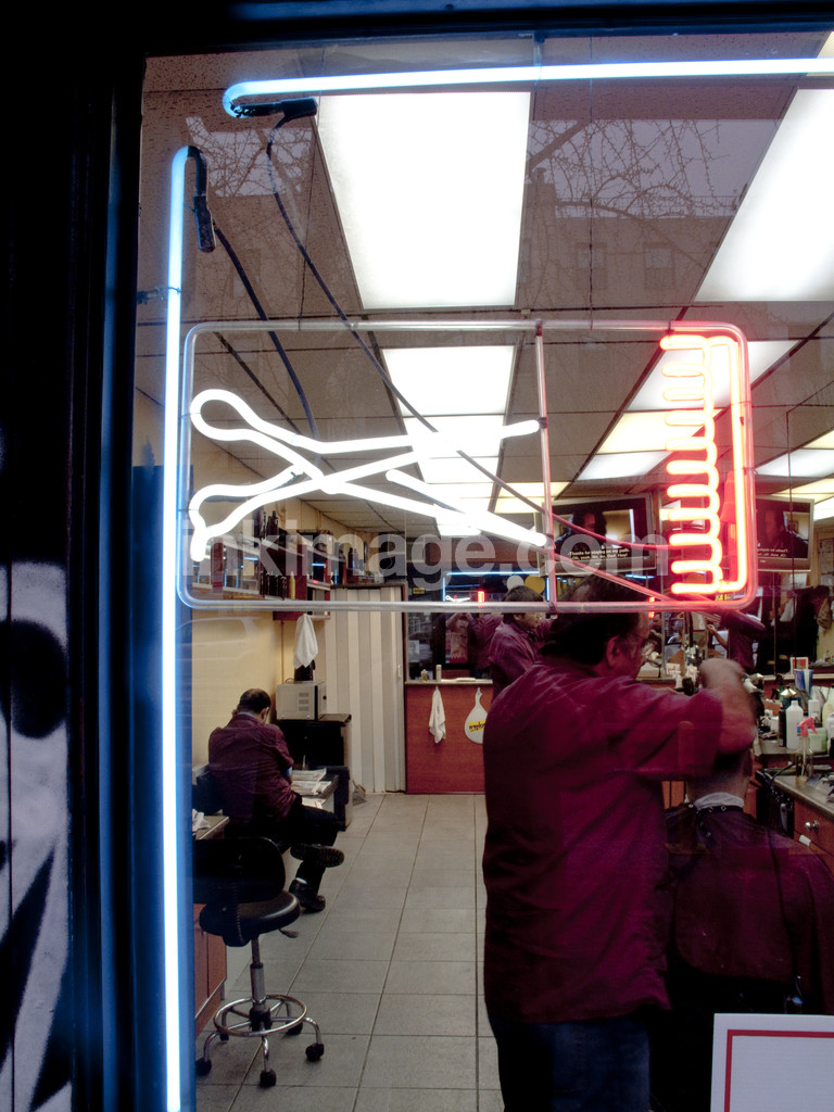 - hairdresser, barber, male, cut, guesstimating, scissors, comb, neon sign, storefront