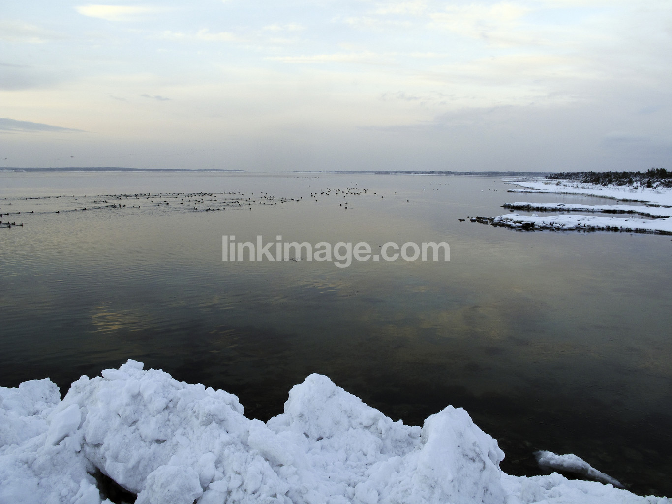 - sea, water, winter, view, spot, winter landscape, coast, shore, birds, snow, sky, reflection, horizon, cloud