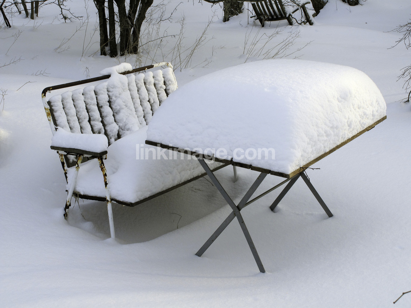 snow, winter, garden, garden furniture, table, bench, rust, forgotten, white, cool, cold