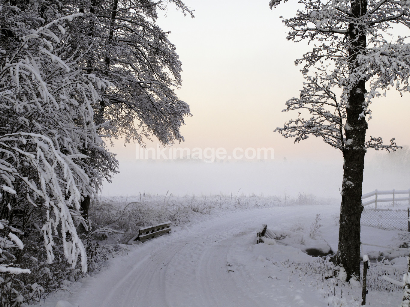 winter, snow, road, winter, dawn, morning, light, cold, cool, haze, fog, pink, turn, nature, field