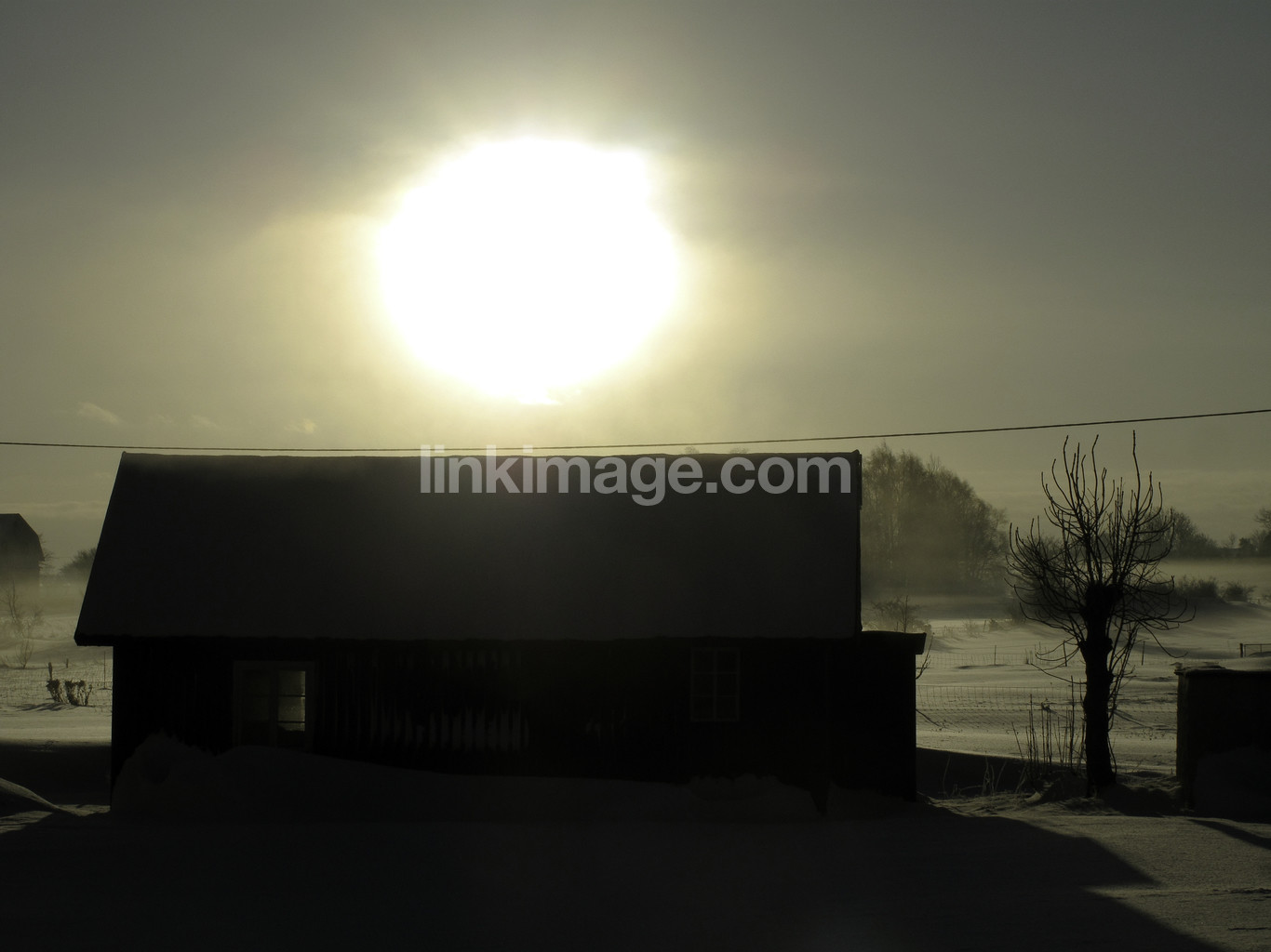 barn, sun, haze, backlight, light, winter, snow, dawn, spot, view, fog, cottage, silhouette