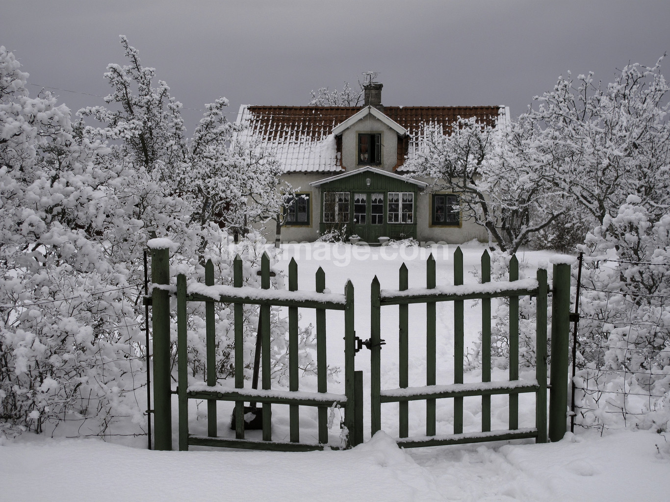- house, croft, summerhouse, country, country built, winter, snow, gate, villa, entre, shrubbery, garden, centered