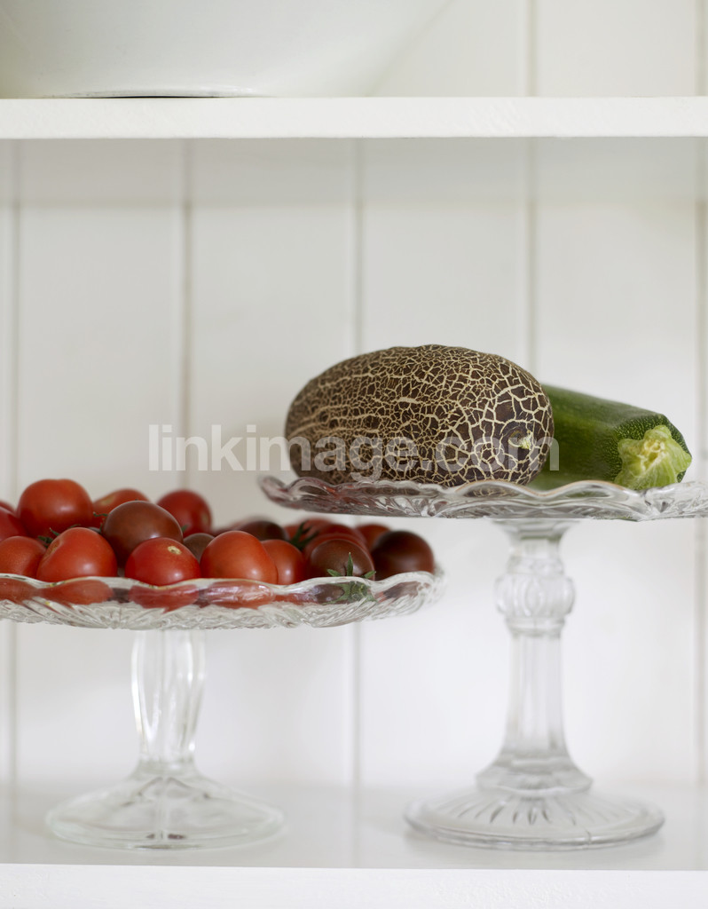 - still life, ornament, detail, interior, kitchen, vegetables, tomato, pumpkin, squash, zucchini, barrel, glass, white, light