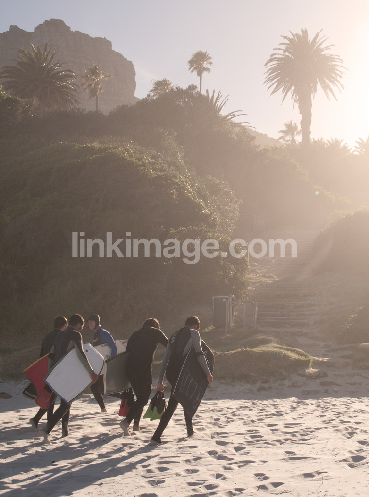 - surfer, guys, adolescents, teens, group, surfboard, wetsuit, sand, shore, dawn, dusk, haze, sunlight, palm, tomography, sports, hobby, leisure