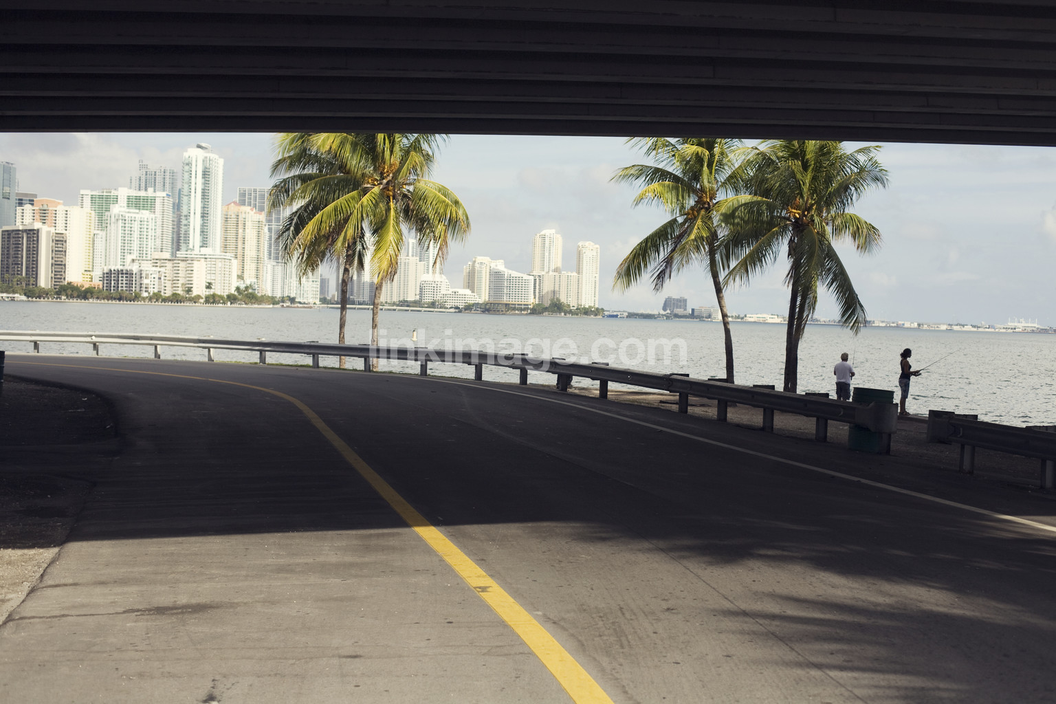 fisherman, girl, skyline, rise, palms, road, crash barrier, sea, sunny, summer, bridge, miami