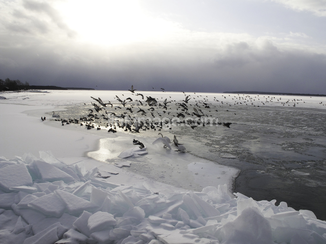 birds, escape, fly, winter, ice, snow, water, sea, coast, winter birds, horizon, weather, light