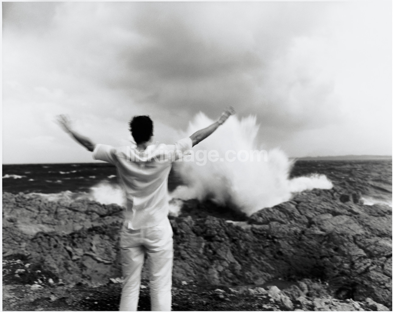 - male, rock wall, rock walls, stones, wave, waves, sea, lake, shore, independent, b / w, black and white