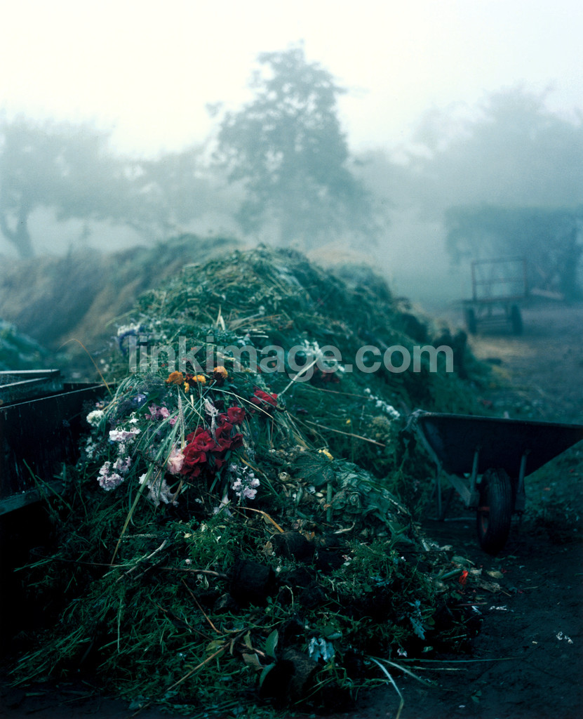 garden, grass, green, fog, obscured, wheelbarrow, dg128, plants, greens, flowers, haze