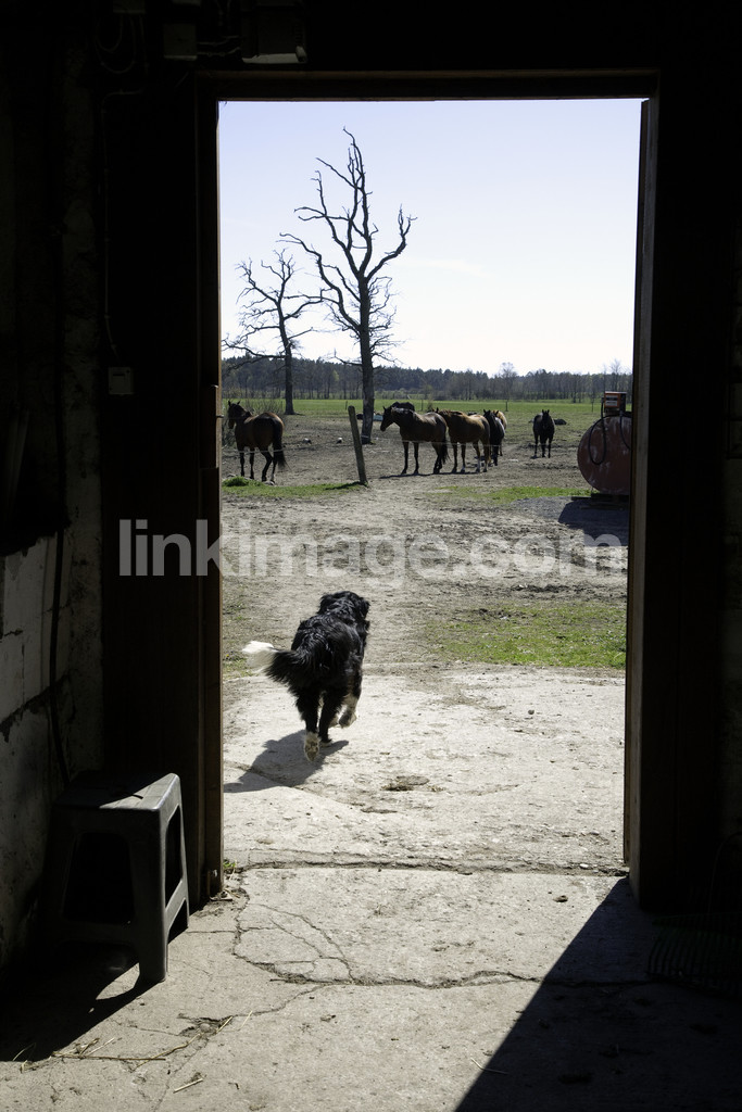 - horse farm, horses, pasture, paddock, dog, doorway, barn, tree