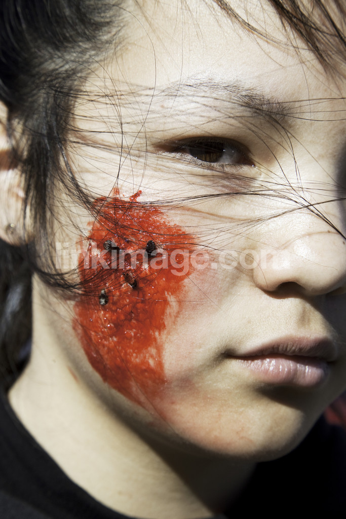 injury, play, pretend, blood, accident, face, portrait, girl, eye, red, gaze