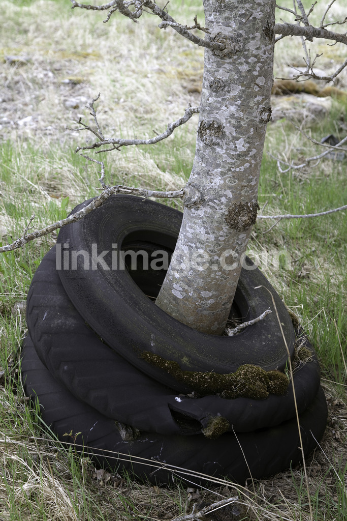 deck, tires, car, tree, time, mystery, old, unknown, grow, three, rubber, forgotten