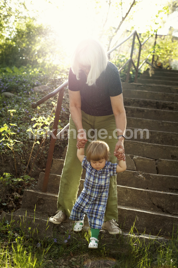 - children, female, grandmother, grandma, stair, go, help, nature, summer