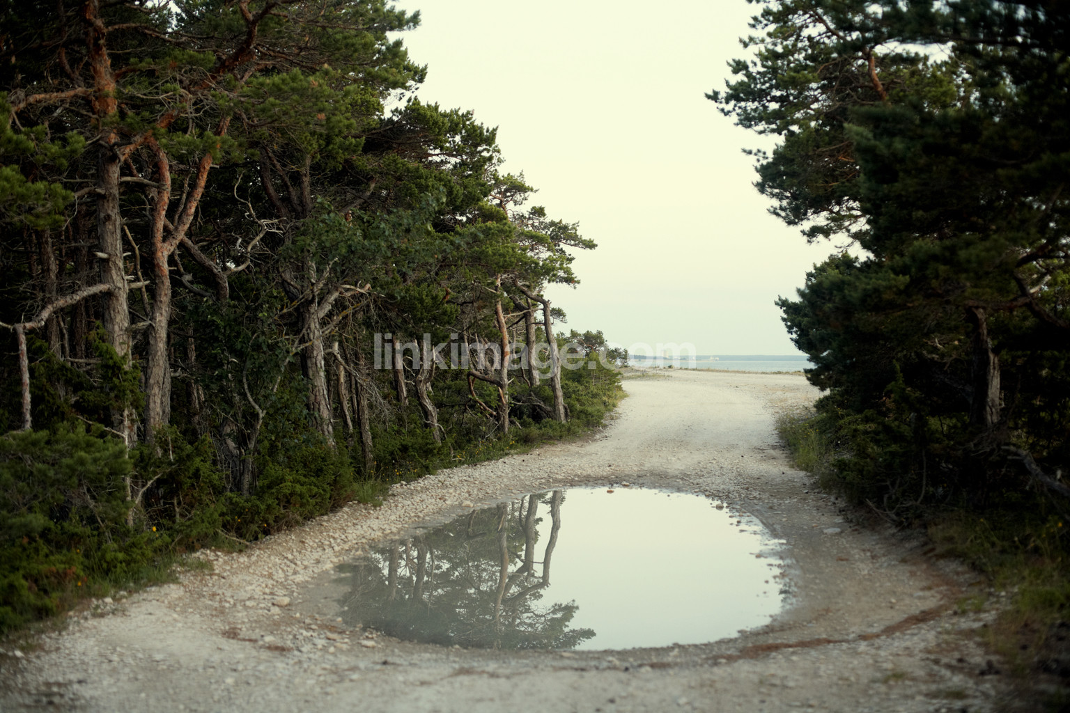 - spot, road, gravel, water, reflection, nature, gotland, pine, forest