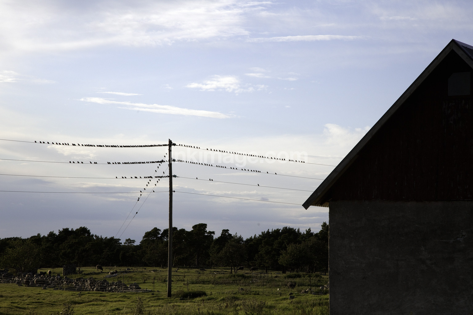 - gotland, birds, fall, move, group, autumn relocating, starlings, spot, view, agricultural, telephone wires, telephone pole, pattern, barn, rest