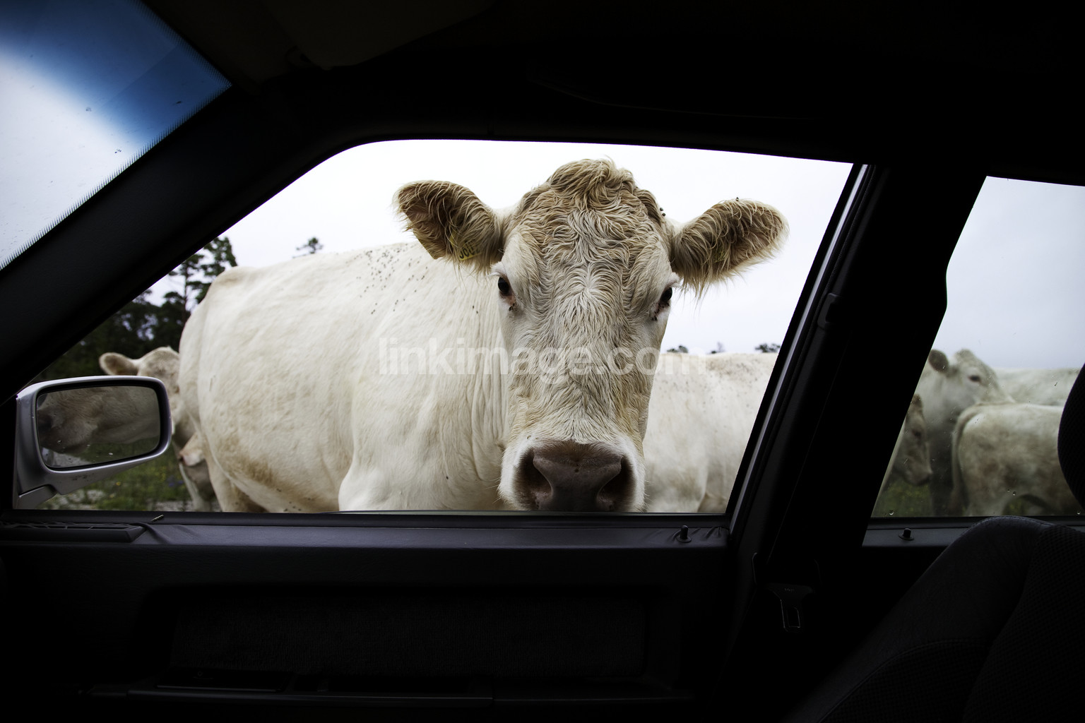 - cow, agricultural, curious, car, car window, gaze, food, beef, hairstyle