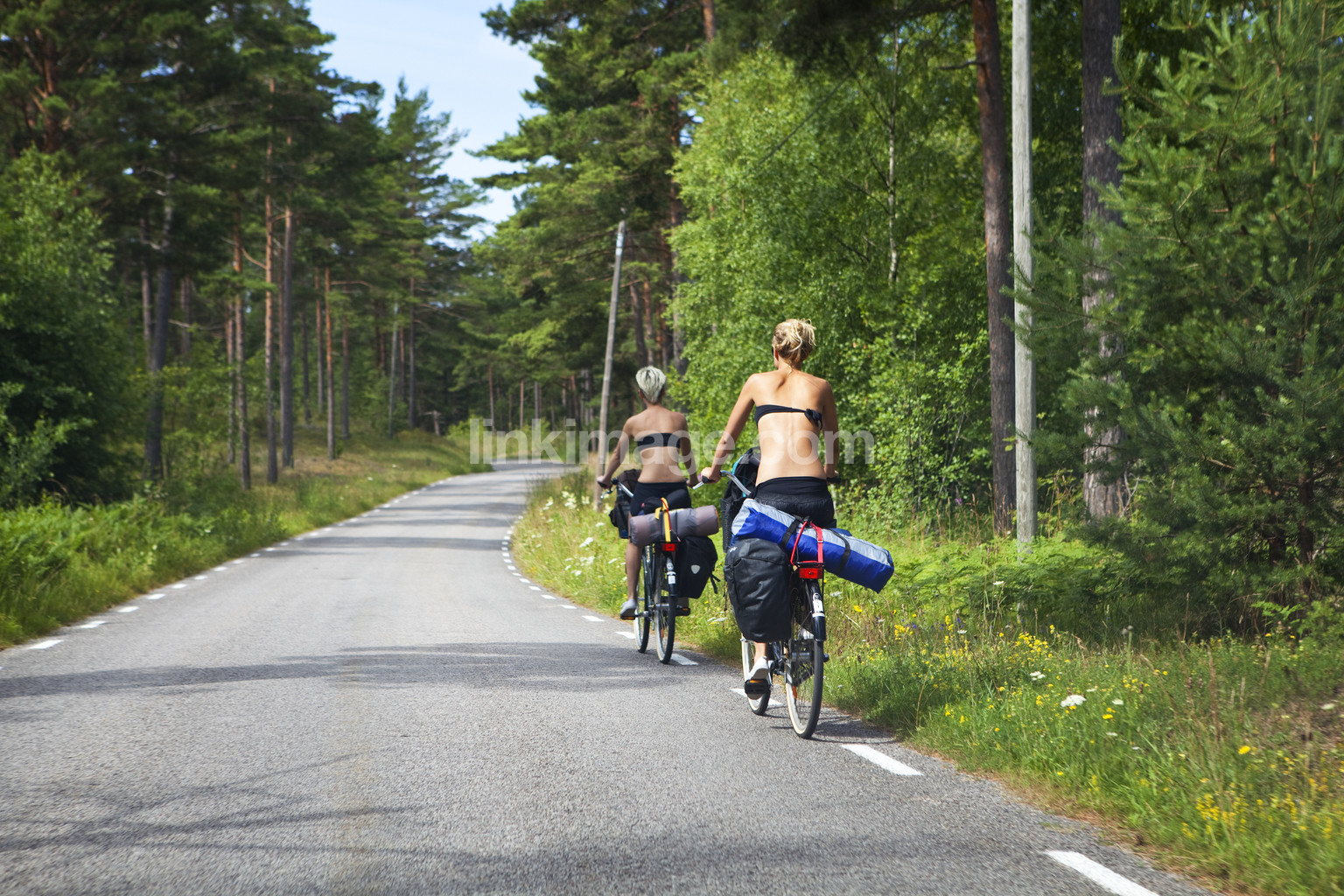 sleeping bag, backpack, cycles, cyclists, holiday, summer, bikini, women, girls, forest, road