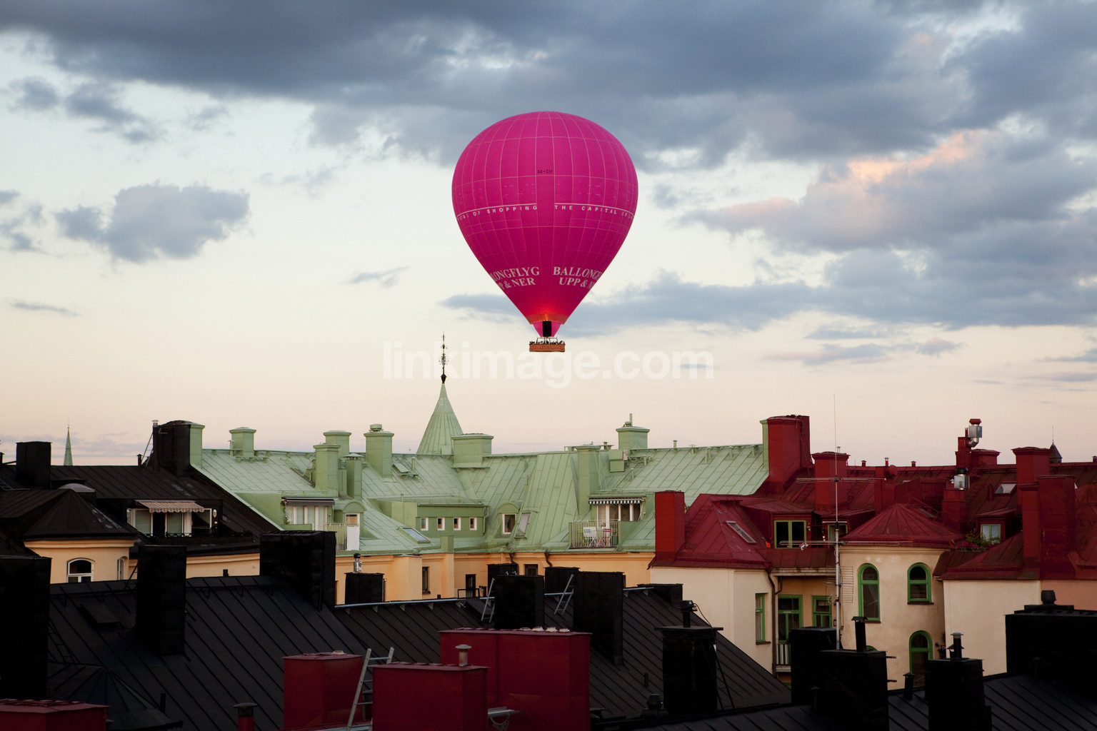 - balloon, hot air balloon, flies, go, traveling, floating, rooftops, house, window, pink, sky, evening, cloud, stockholm, ceiling, red