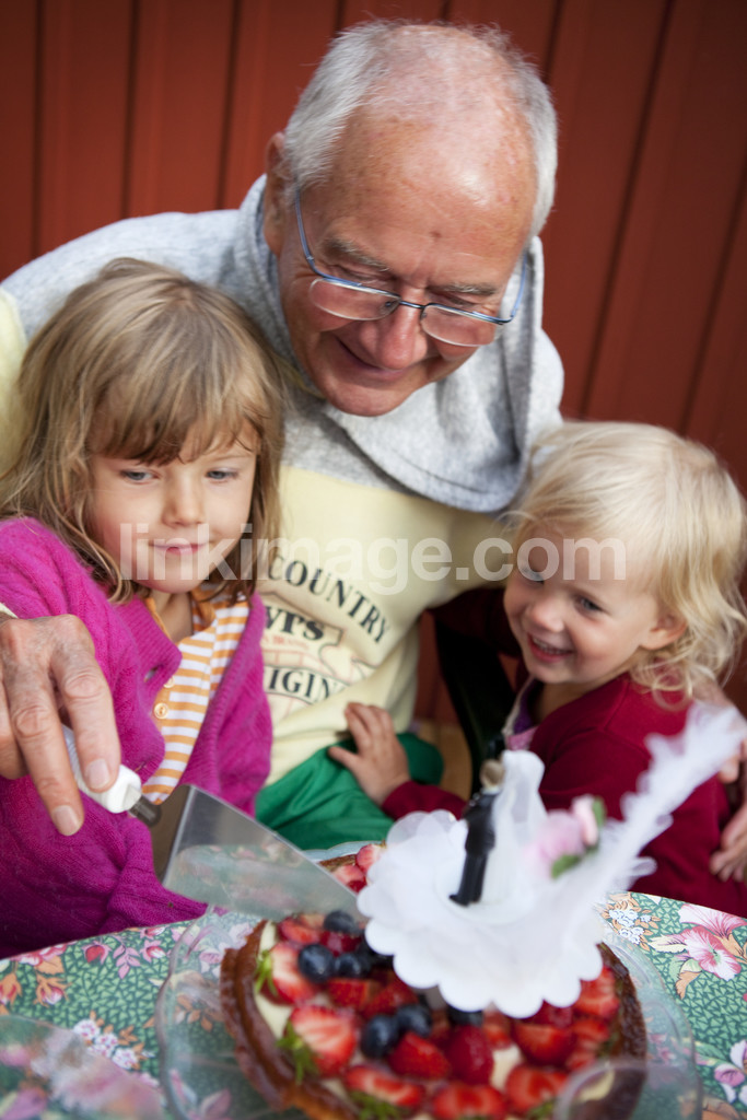 - grandpa, cake, wedding cake, happy, laughing, children, grandchildren, grandfather, berry, fruits, wedding couples, generations, older, girls, siblings