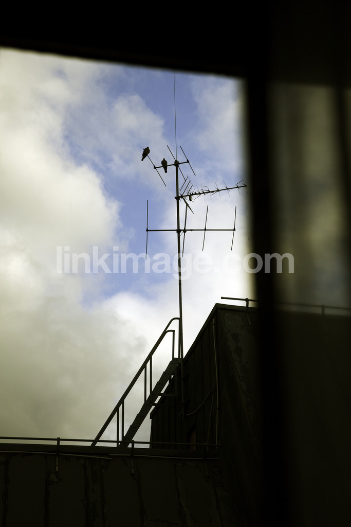 city, metropolitan, antenna, pigeons, birds, two, window, views, view, tv, cloud, sky, ceiling, light, weather