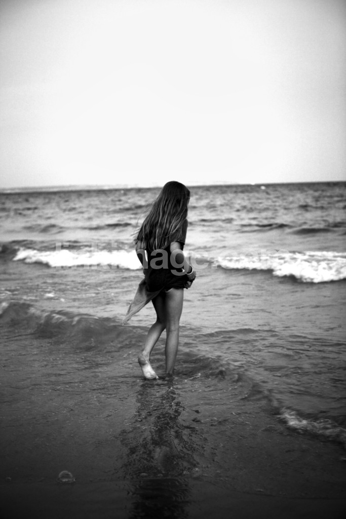 - holiday, black and white, black, white, girl, water, sea, waves, evening
