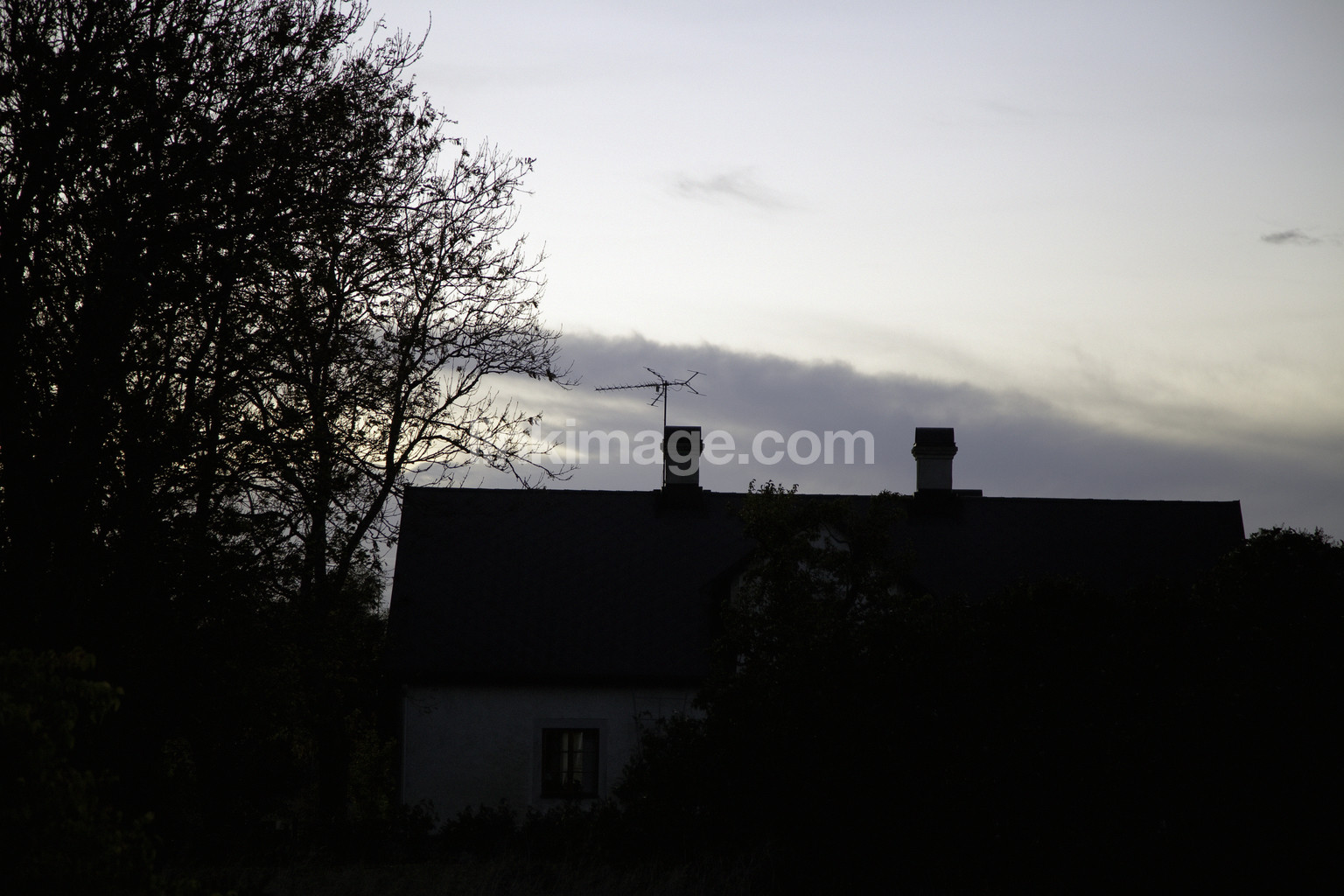 - house, yard, villa, country, country built, silhouette, dusk, evening, stack, ceiling, sky, tv, antenna, fall, light, tree