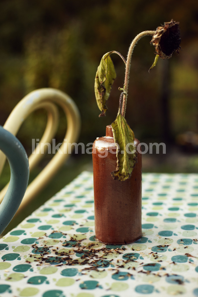 pot, table, chair, flower, wilted, still life, death, jar, fall, leaf, sunflower, pattern, apples