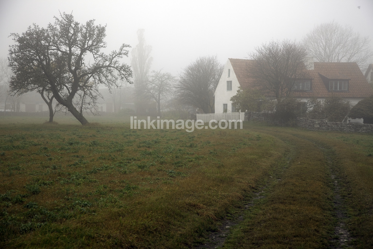 - fårö, spot, fall, fog, yard, house, gotlandshus, limestone, time residents, homes, road, tree