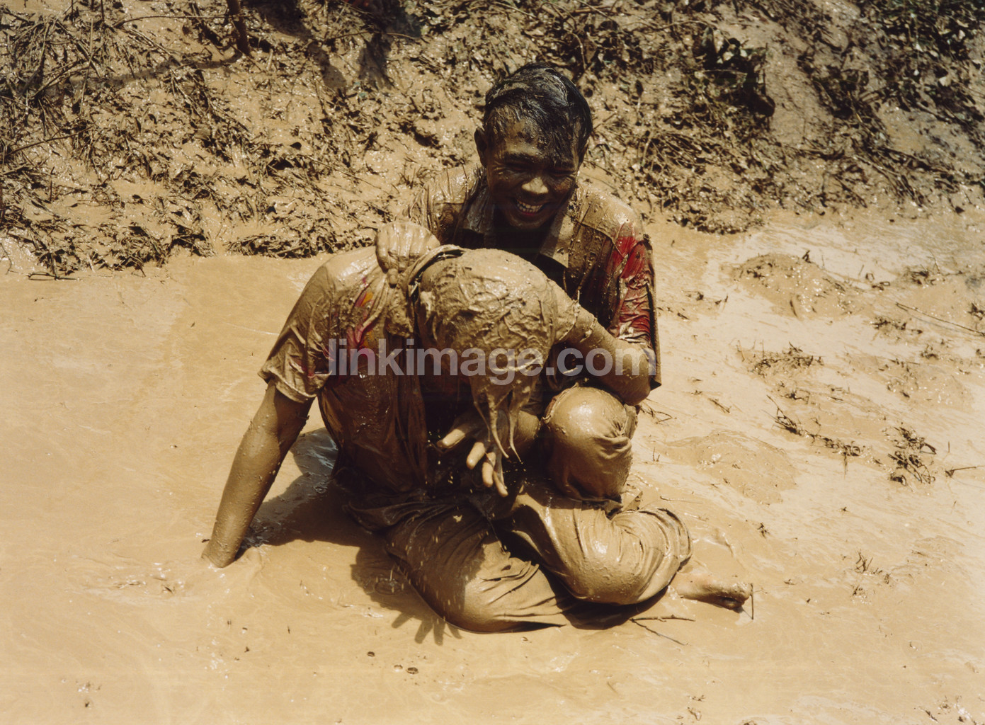 - games, wrestling, play, guys, mud puddle, laughing