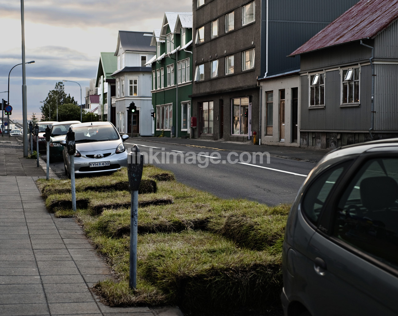 - island, reijkjavik, art installation, art, grass, street, parking, cars, city, buildings, nature, urban, evening
