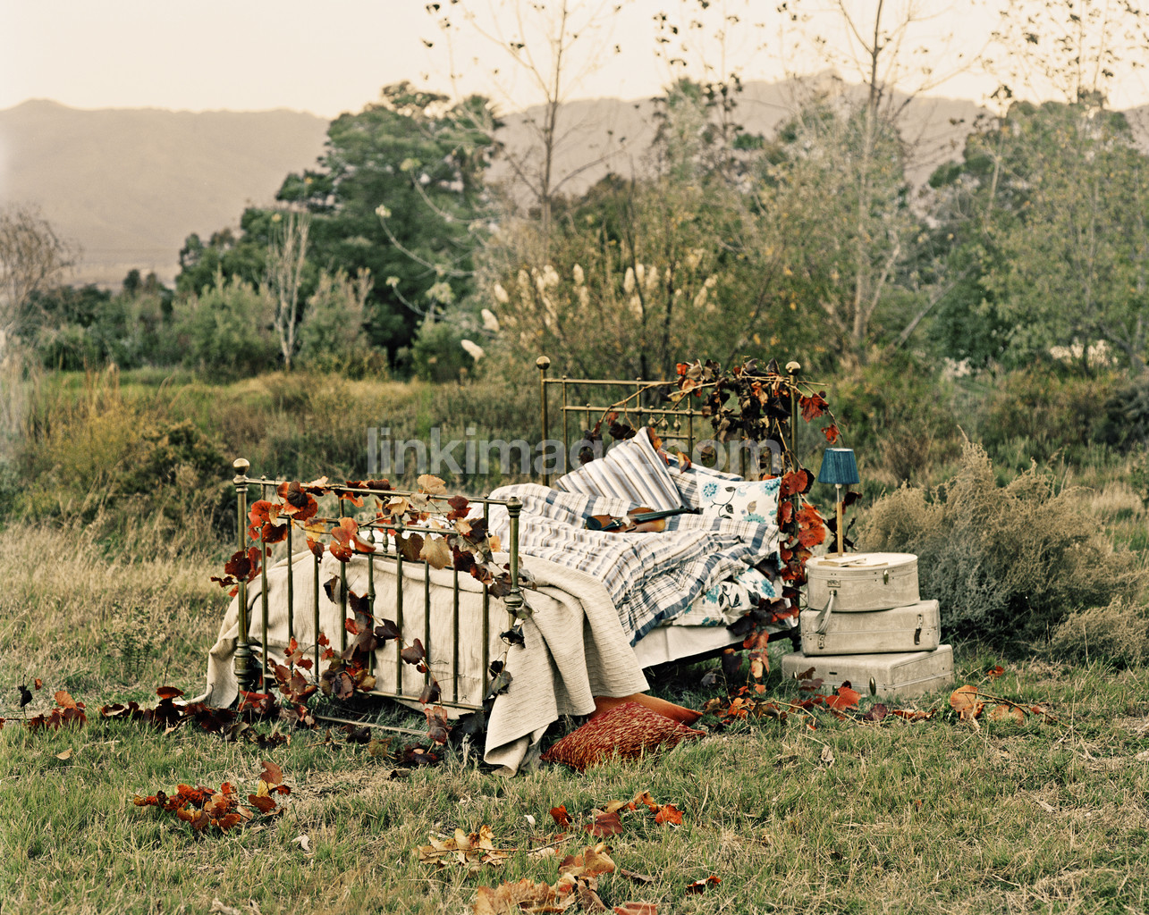 - bed, fall, leaf, autumn leaves, colors, nature, sun, blanket, covers, cushion, grid, dream, memories, lamp, greens, tree, cozy, dreamy, red, summer, advertising, boxes, flowers, spot, grass