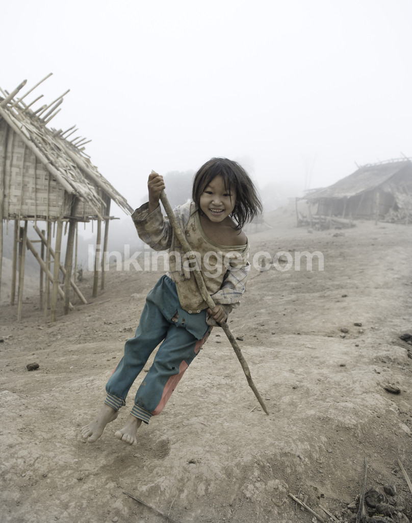 - girl, happy, play, laos, asia, sand, dirty, broken, track, by, huts, trip