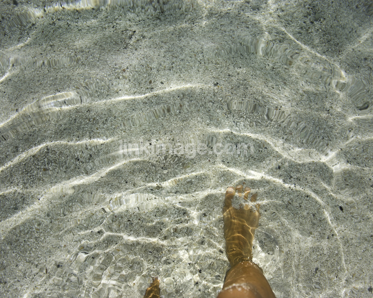- Feet in crystal clear water with a sandy bottom.