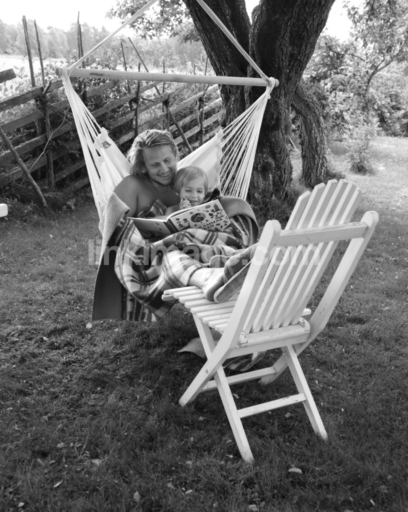 - Man reading a book for a little boy in the hammock.
