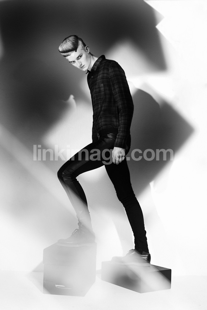 - fashion, model, male, shadow play, hair, hairstyle, earring, shirt, black, shoes, stools