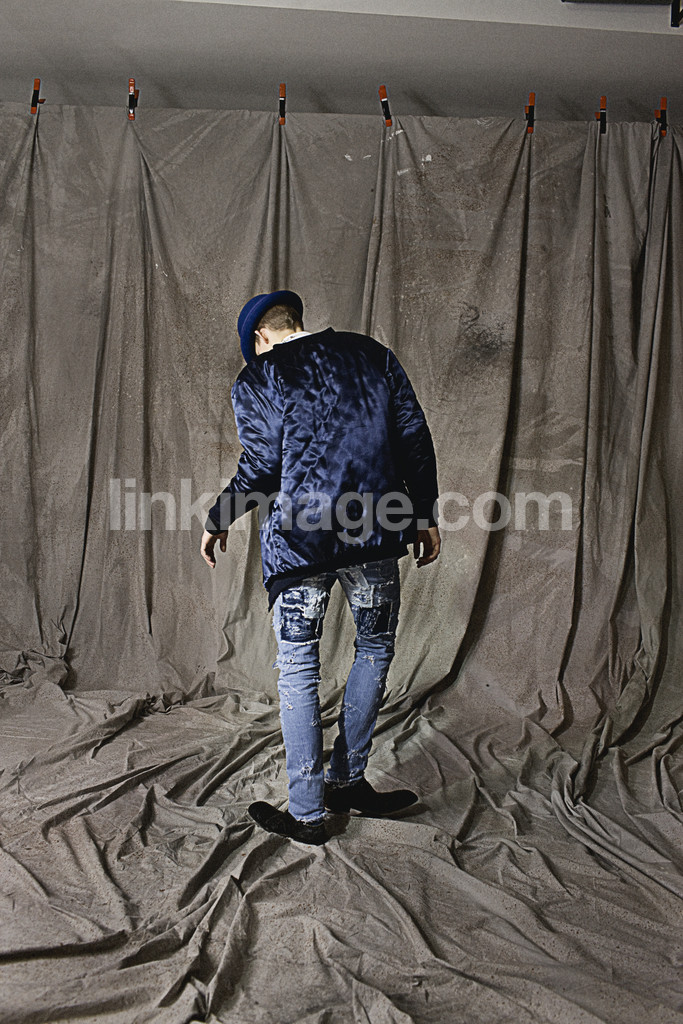 - cardigan, hat, back, wrinkled, fund, fabric, light, studio, male, fashion, model, jeans, gray