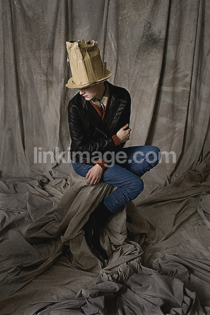 - hat, cardboard, fabric, fund, light, studio, jeans, fashion, model, male, wrinkled, gray