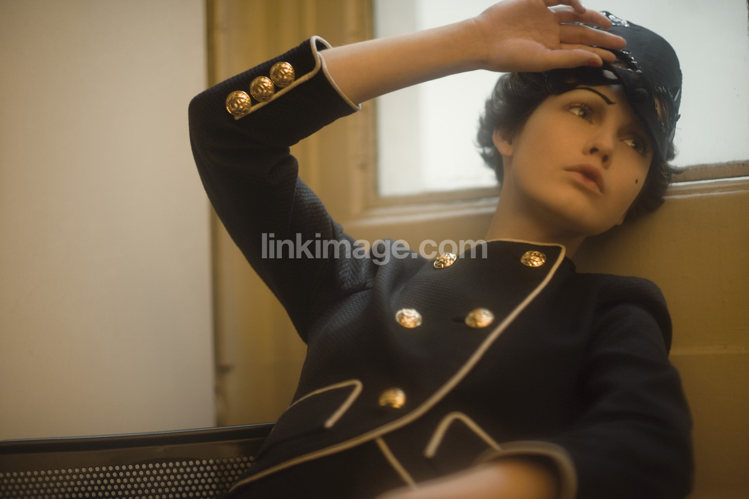 - gold, kappa, jacket, blazer, buttons, fashion, model, female, window, tilt, lie, sit, hat, headdress