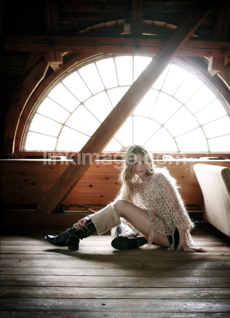 - window, sunlight, beam, wood, floor, sit, fashion, model, female, shoes, knitted, blouse, wind, alone