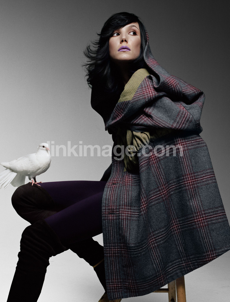 - bird, death, stuffed, white, knee, sit, chair, windsor chair, fashion, model, female, jacket, kappa, hood, checkered, purple, gaze, watch