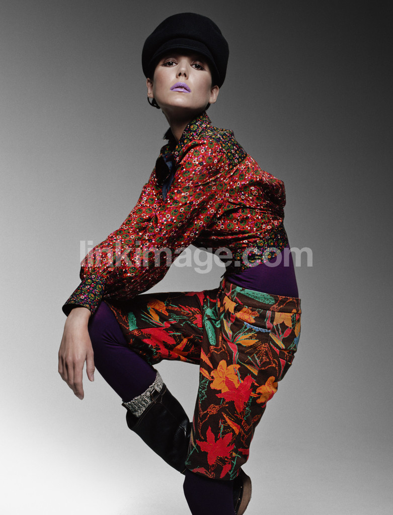 - bangs, gaze, fashion, model, female, pattern, colors, position, stand, hanging, flowers