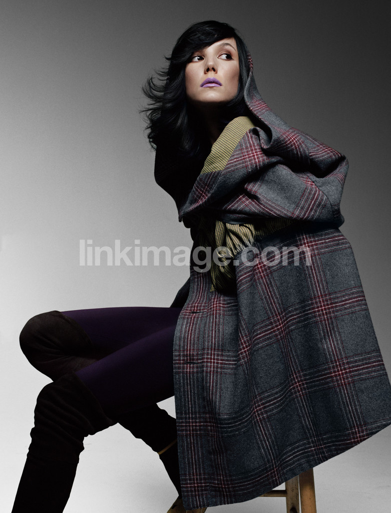 - fashion, model, female, sit, chair, stool, wood, jacket, kappa, hood, checkered, purple, watch, gaze