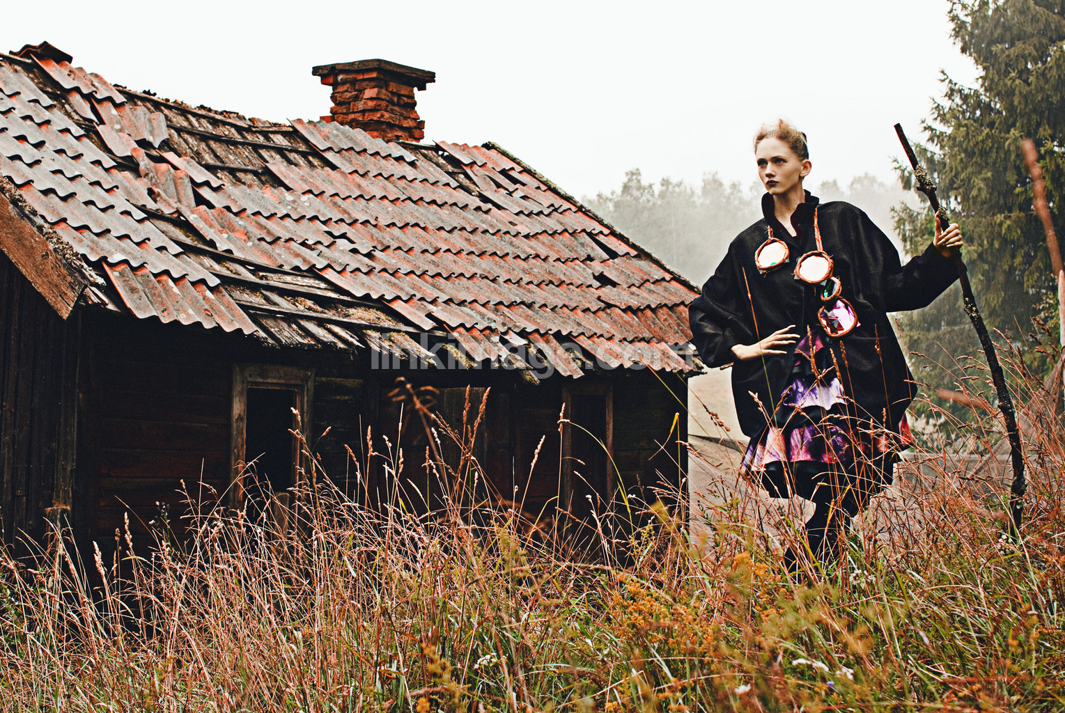 - house, old, broken, ceiling, brick, growing, grass, fashion, model, female, dress, stand, stick, cane, hold, support, wait