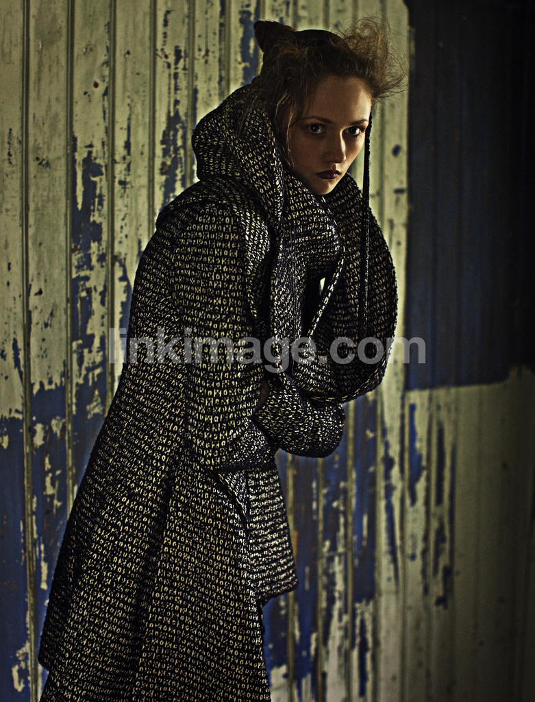 - hood, jacket, kappa, fashion, model, female, wood, wall, house, dark, alone, stand
