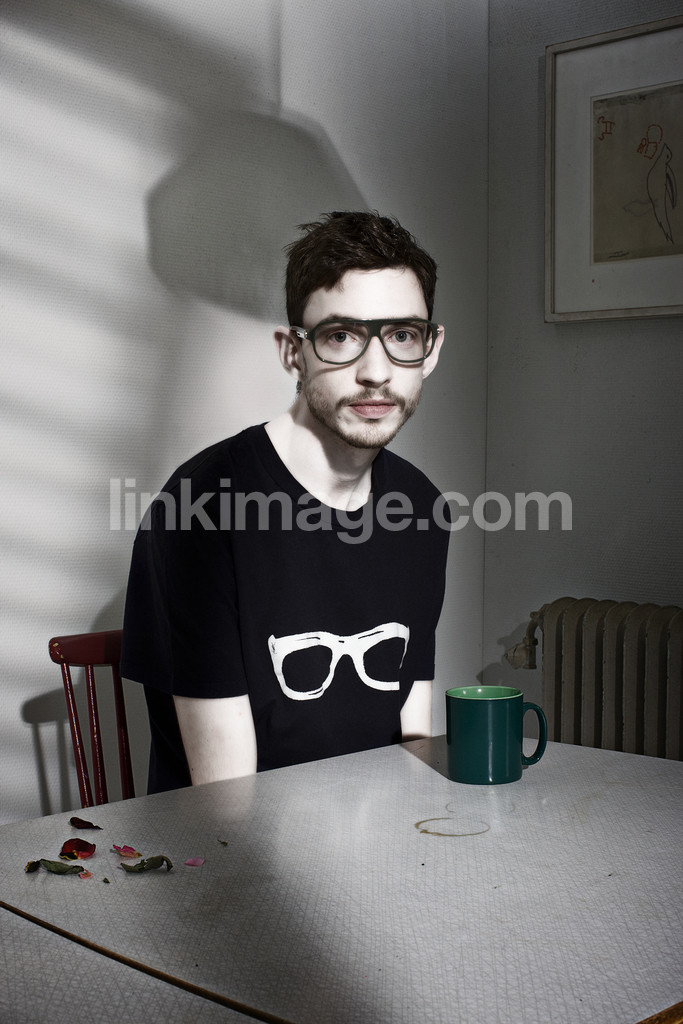 - male, eyeglasses, kitchen, plate, mug, drinking, coffee ring, tired, alone, shadow play, white, black, green, chair, windsor chair