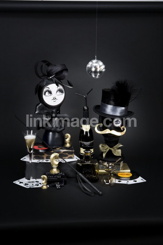 - black, white, deck of cards, drink, glass, face, mustache, disco ball, bow, gold